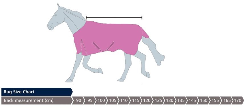 En av de absolutt viktigste aspektene når man kjøper et dekken til sin hest er selvfølgelig at det passer. Har man allerede et dekken som sitter bra, så er det selvfølgelig enklest å utgå fra den størrelsen, men det er ikke alltid man har den muligheten. Det er egentlig ganske enkelt, men grunnen er et sted å se på rette verdier. Her i Europa måler vi dekkets størrelse over ryggen, i motsetning til i USA, UK og Australia hvor man måler nedre delen av dekkenet. Se på bildet nedenfor og mål langs ryggen, fra manken der dekkenet normalt skal begynne (enkelt å google litt bilder hvis man er usikker) hele veien bak til halen. Dekken kommer i størrelser med 5-centimeters intervall, og for utedekken anbefaler vi at du runder oppover, fordi hesten vender rumpa mot vind og blåst, så det er viktig at dekkenet ikke er for kort.