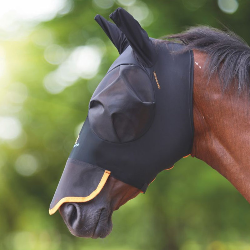 ""Stretch med Ører & Nese"" Fluehette fra Shires er designet for å gi hesten din effektiv beskyttelse mot fluer og insekter. Den er laget av mykt stretchmateriale som er både komfortabelt og funksjonelt. Øynene beskyttes med 180-graders kopper, noe som gir god synlighet samtidig som skadedyr holdes unna. Ørene er beskyttet med et mykt og pustende materiale som holder irriterende insekter borte. Fluehetten har en praktisk glidelås under haken, noe som gjør den enkel å ta på. Fleeceforede og elastiske sømmer gir ekstra komfort, og stretchmaterialet har utmerket pusteevne. I tillegg tilbyr fluehetten 70% UV-beskyttelse, noe som er en fordel på solfylte dager.