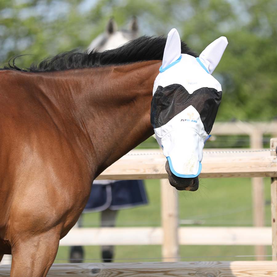 Shires Ultra Pro er en helt dekkende fluemaske som spesielt anbefales for solfølsomme hester. Den beskytter mot solbrenthet og solbleking med hele 70%+ reduksjon av UV-stråler. Øyeområdet er laget av mesh-nett og gir behagelig skygge over øynene mens god sikt bevares. I tillegg gir masken selvfølgelig godt beskyttelse mot sommerens irriterende fluer og insekter med sin forlengede snute og integrerte ører.