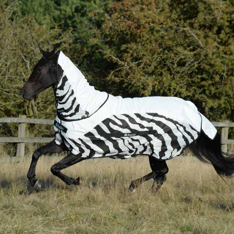 Buzz-Off Rain Zebra tilbyr samme beskyttelse mot fluer som Buzz-Off Zebra, men har også en vanntett og pustende ryggdel som beskytter hesten din mot regnbyger. Den sølvfargede fargen på dekkets overside reflekterer solstråler og hjelper dekket med å holde temperaturen nede, samtidig som zebramønstrene holder fluer unna, da mønsteret, ifølge forskning, forvirrer dem.