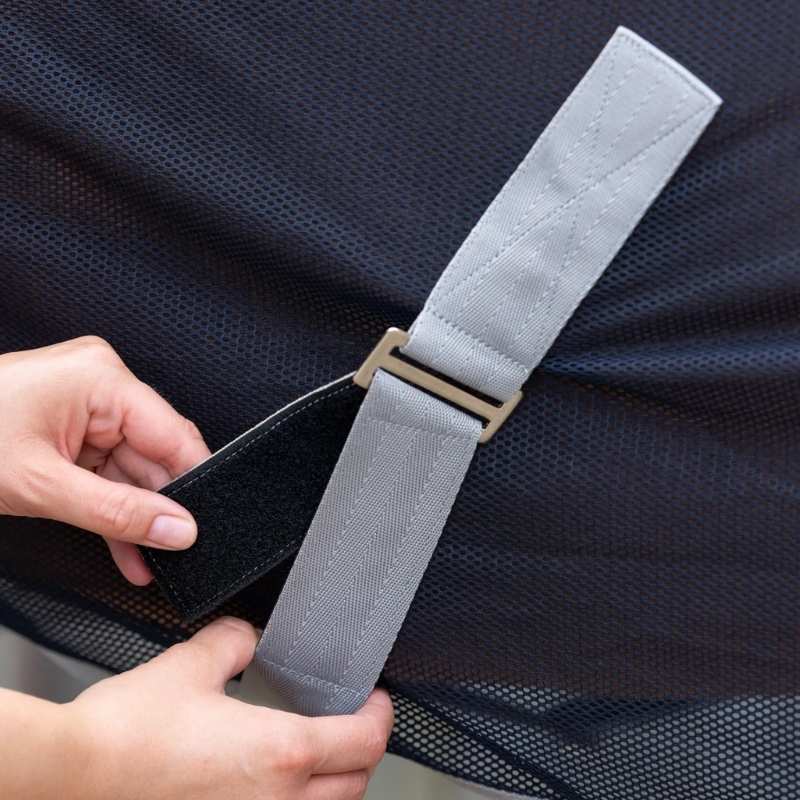 Fluedekken RugBe fra Covalliero gir lett og luftig beskyttelse for hesten din, laget i marineblå polyester. Dette dekkenet gir effektiv beskyttelse mot irriterende fluer og stikkende insekter, samtidig som det er behagelig å ha på. Det fjærlette og pustende meshmaterialet sikrer god luftsirkulasjon og rask tørketid, noe som gjør det ideelt for bruk i stallen eller under transport. Dekkenet har avtakbare kryssgjorder for en sikker passform og fleksibel bruk, samt en praktisk borrelåslukking foran.