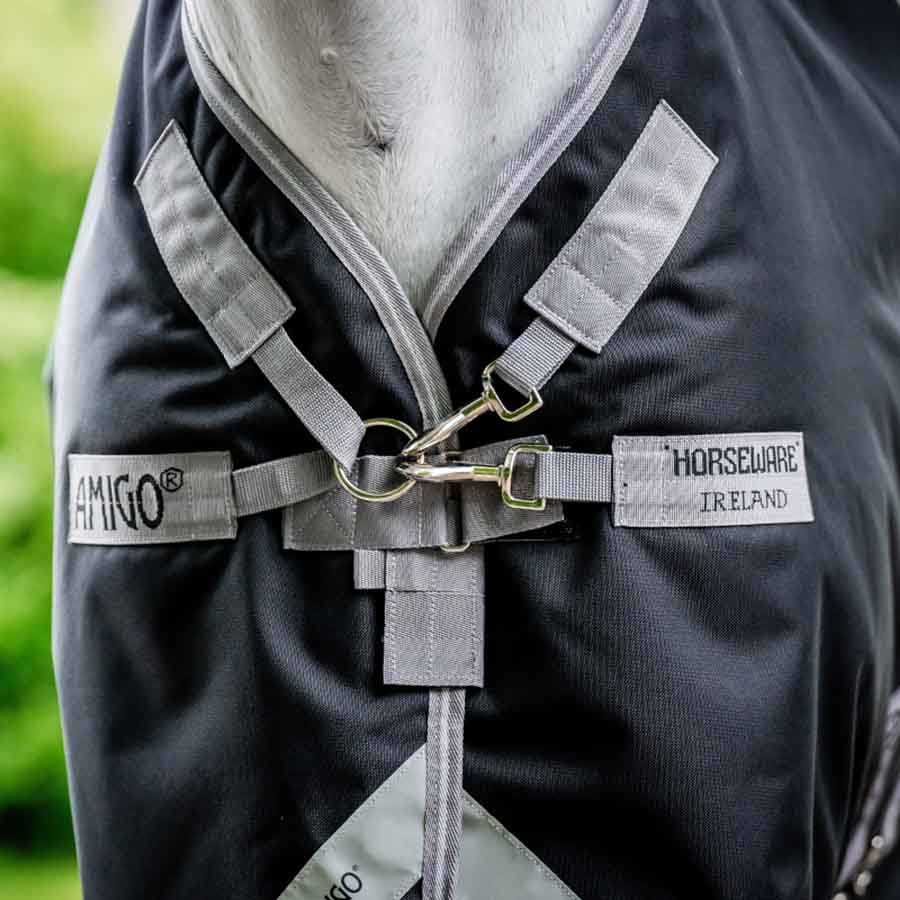 Amigo Bravo 12 Plus, her i svart, er et høykvalitets utedekken som gir hesten din pålitelig beskyttelse i variert vær. Laget av slitesterk 1200D polyester er dekkenet både vanntett og pustende, noe som hjelper hesten din med å holde seg tørr og komfortabel uansett værforhold. Med en lett 100g fylling gir det akkurat passe varme når temperaturen begynner å synke.