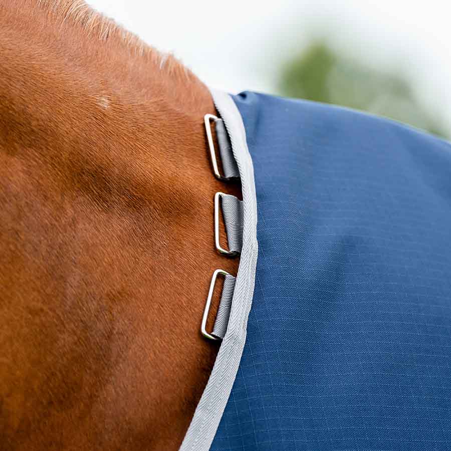 Det marineblå vinterdekkenet er utstyrt med en rett frontknapping og formede benvalv for å gi hesten maksimal bevegelsesfrihet, mens innsiden er fôret med antistatisk og antibakterielt polyesterfôr for å forhindre gnag og bidra til å opprettholde en frisk, blank pels. For ekstra tilpasningsdyktighet leveres dekkenet med tilhørende hals, og er utstyrt med feste for liner. Liner kan kjøpes separat hvis hesten din trenger ekstra tykkelse og varme.