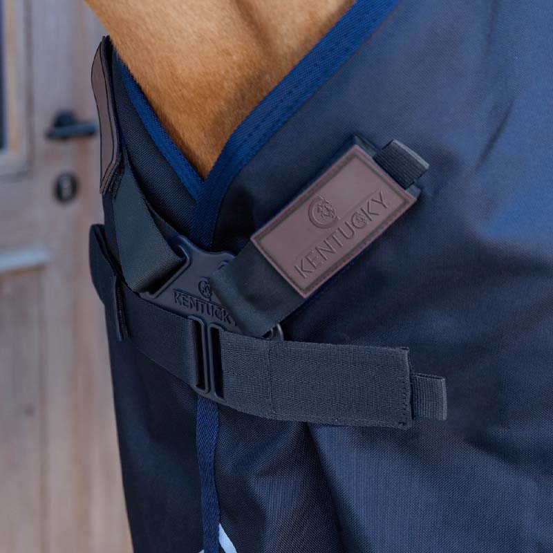 Dekkenet er laget av kraftig 1200D ripstop-polyester med vanntett og pustende belegg, som holder hesten tørr samtidig som fukt transporteres bort. Den sømløse ryggen reduserer risikoen for lekkasje, selv i kraftig regn.