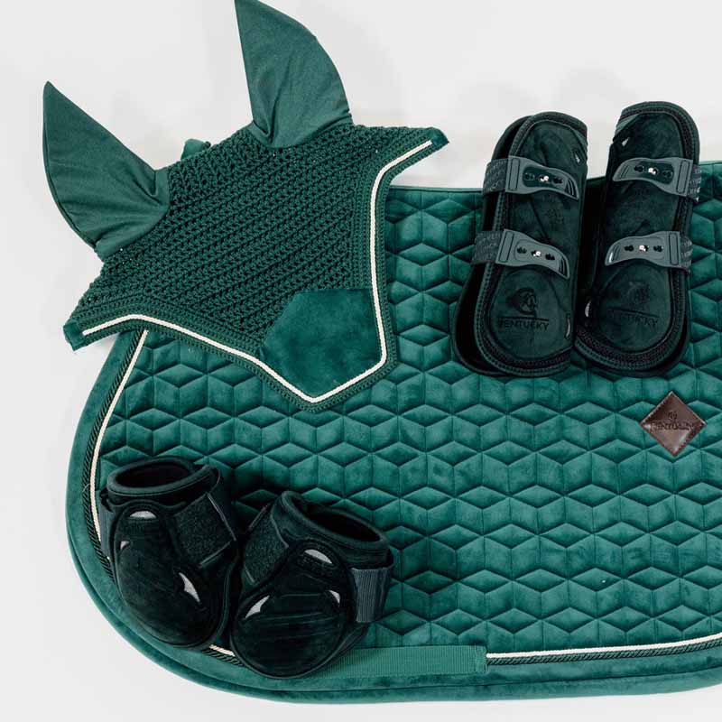 Fetlock Boots Young Velvet i mørkegrønn er det perfekte valget for dem som elsker fløyel og vil gi hestens bein det beste beskyttelsen. Disse bakbeinsbeleggene er ikke bare stilige, men de er også laget av høykvalitetsmaterialer. Det sterke EVA-skallet har flere ventilasjonshull for optimal ventilasjon og kjøling, noe som forhindrer overoppheting av sener.