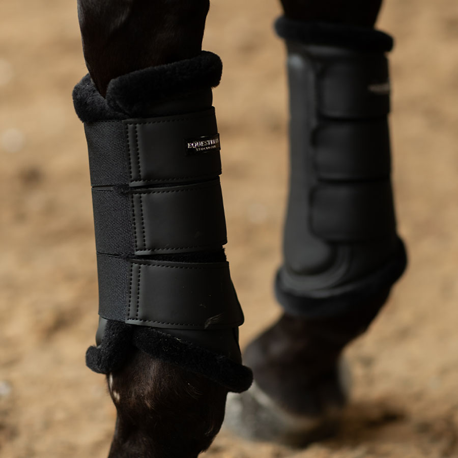 Treningsbelegg fra Equestrian Stockholm er høykvalitets beinskjold designet for å gi utmerket beskyttelse for hestens ben. De har en allround passform og kommer i en elegant svart farge med sølvdetaljer. Laget av syntetisk PU-lær med en matt finish, er disse beleggene både stilige og funksjonelle. Innsiden er foret med myk teddy for ekstra komfort mot hestens ben. De elastiske borrelåsbåndene er prydet med den stilige Equestrian Stockholm-logoen. Disse beinskjoldene selges i par og passer både for fremre og bakre ben.