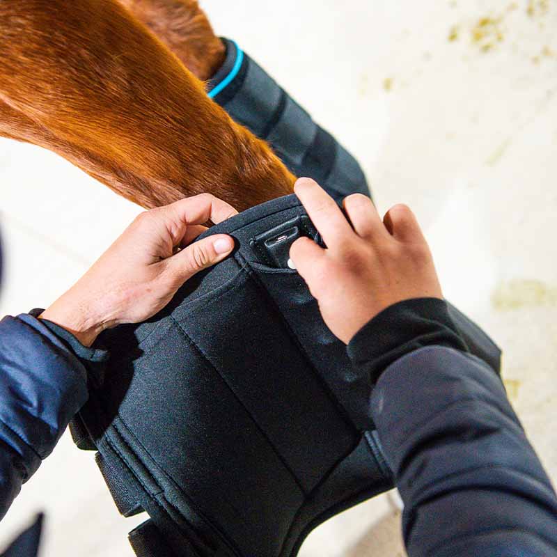 Beleggene er laget av neopren, som er et smidigt, lett og smuss- samt vannavstøtende materiale. Disse har fire innerlommer hvor vibrasjonspanelet plasseres i. Man bruker ikke flere paneler i flere lommer samtidig, kun ett vibrasjonspanel per ben. De ulike lommene er til for at man skal kunne flytte panelet fra eventuelt sensitive partier og styre hvor panelet virker. Standard er å bruke den lommen som er lengst bort fra borrelåsene. Panelet plasseres med den flate siden mot hesten og med på- og avstengningsknappen oppover. Når du har satt på belegget på hesten setter du så på panelet ved å holde inne knappen i 3 sekunder.