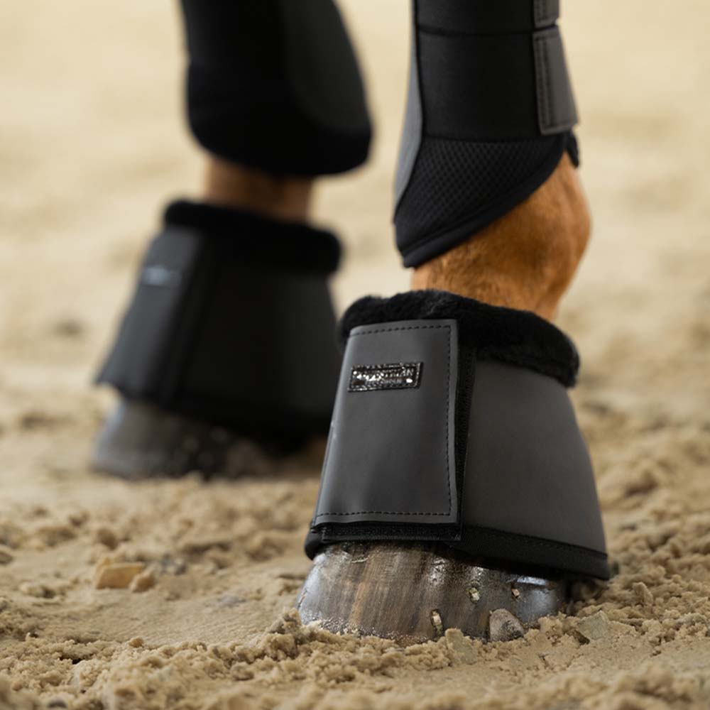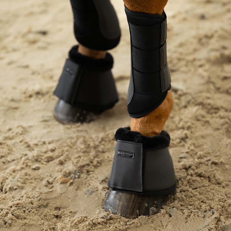 Myk teddy-kant og neoprenfôr (ca. 6 mm) gir god komfort og støtdemping, samtidig som de beskytter hestens høver mot støt og skader. Den brede borrelåslukkingen sikrer stabil passform, og logoen gir et stilfullt preg.