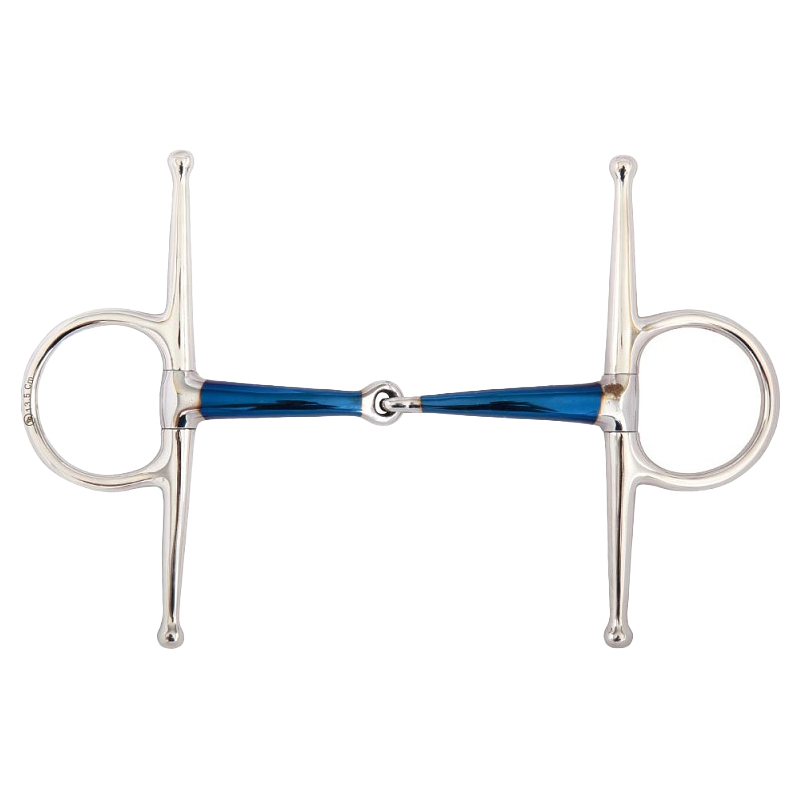 Single Jointed Full Cheek Snaffle Sweet Iron er et to-delt trinsebitt med parerstenger, også kalt Full Cheek. Laget av rustfritt stål samt forsynt med en blå, stålblandet Sweet Iron-belegg hvis effekt både stimulerer tyggprosessen og hever spyttproduksjonen.