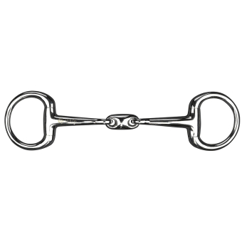 Dobbeltleddet eggbutt-bitt med plate. Bittet har faste ringer og er laget av rustfritt stål.