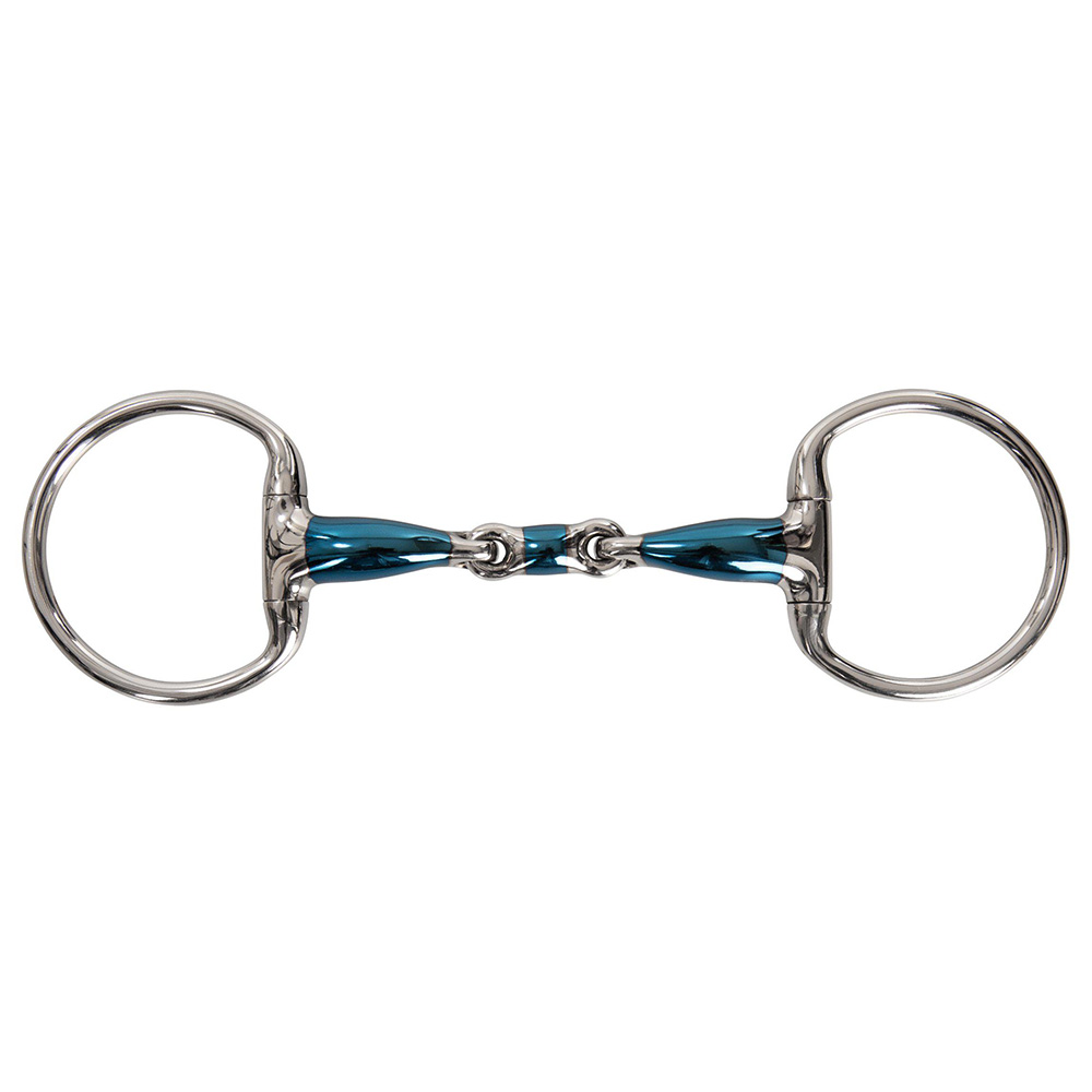 Et høykvalitets dobbeltleddet eggbutt-bitt fra Lippo med faste ringer og Lock Up-funksjon. Bittet er laget av rustfritt stål og belagt med blå Sweet Iron, som stimulerer hestens tyggebevegelse og øker spyttproduksjonen.