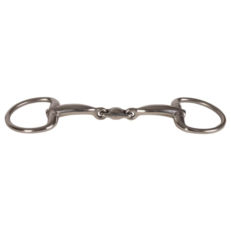 VELARI tredelt muffebitt i rustfritt stål er designet for å gi jevn trykkfordeling og stabil kontakt med hesten. Den tredelte mundelen reduserer nøtteknekker-effekten og fordeler trykket jevnt over tungen og lanene, noe som gir en myk og responsiv følelse. Dette bittet er spesielt egnet for hester med lavere gane eller de som er følsomme for trykk fra todelte bitt. De faste ringene holder bittet stabilt og reduserer risikoen for klyping, og gir stabile og pålitelige tøylerhjelper. Skyll med varmt vann etter bruk og tørk grundig. Oppbevar tørt og sjekk regelmessig for slitasje.