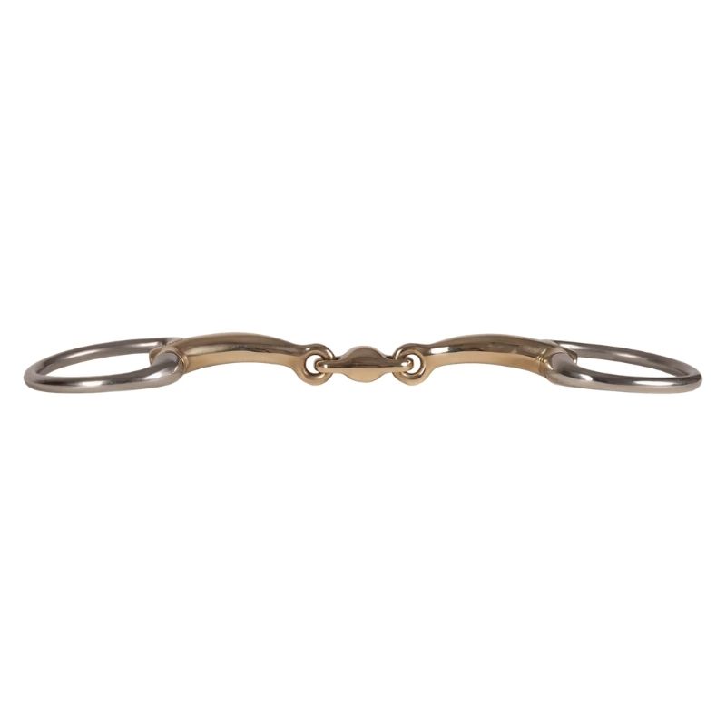VELARI tredelt muffebitt Sweet Copper 16mm gir jevn trykkfordeling og fremmer avslapning hos følsomme hester. Sweet copper-mundelen har en naturlig søt smak som stimulerer spyttproduksjonen, noe som hjelper hesten å forbli myk og aksepterende i kontakten. De faste ringene gir stabilitet og jevne tøyler, reduserer sidebevegelser og risikoen for klyping. Denne konstruksjonen passer spesielt for hester med lav gane og de som er følsomme for trykk fra todelte bitt. Tykkelsen er 16 mm, og det anbefales å skylle bittet i varmt vann etter bruk og tørke grundig. Oppbevar tørt og sjekk regelmessig for slitasje.