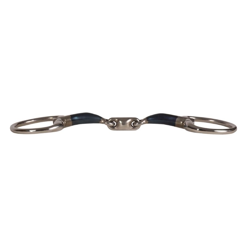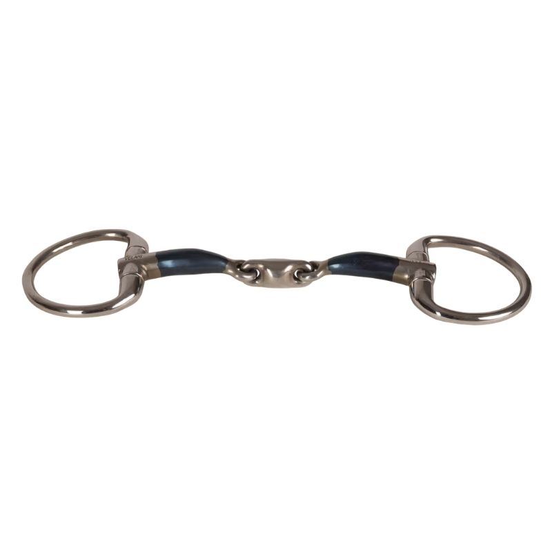 VELARI tredelt muffebitt er designet for jevn trykkfordeling og stabil kontakt. Med et munnstykke i sweet iron som oksiderer naturligt, fremmer det spyttproduksjon, noe som hjelper hesten å forbli myk og aksepterende. De faste ringene reduserer sideveis bevegelser og risikoen for klyping, og gir pålitelige tøylerhjelper. Denne konstruksjonen passer spesielt for hester med lavere gane og de som er følsomme for trykk fra todelte bitt. Skyll i varmt vann etter bruk og tørk grundig. Oppbevar tørt og sjekk regelmessig for slitasje.