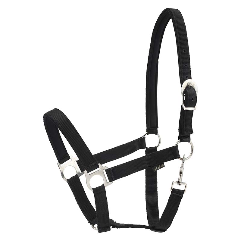 Enkel, svart grime, med metalldeler i sølv, og åpning med karabinkrok. Polstret over nese og nakke for best komfort, samt justerbar nakkerem som gjør at du lett kan tilpasse grimen til nettopp din hest.