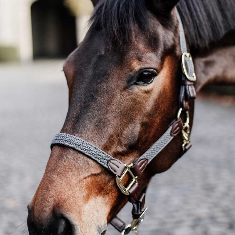 Materialet er vann- og smussavvisende, og det syntetiske læret er mykt og fleksibelt fra første bruk. Justering på siden og under haken gir god passform til ulike hestetyper. Gullfargede beslag gir et stilrent uttrykk.