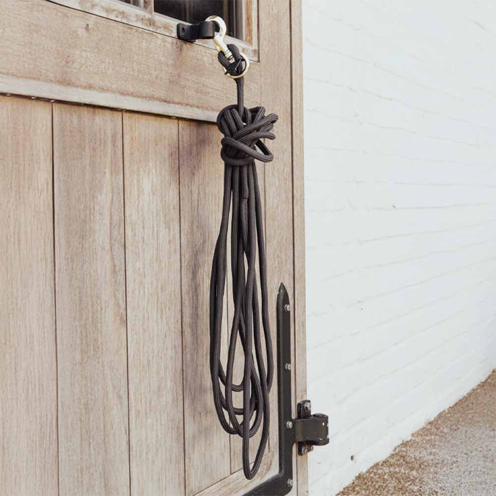 Den svarte longeringslinen er 8 meter lang og utstyrt med en krok som er enkel å feste og løsne. En løkke i enden gjør det enklere å holde linen.