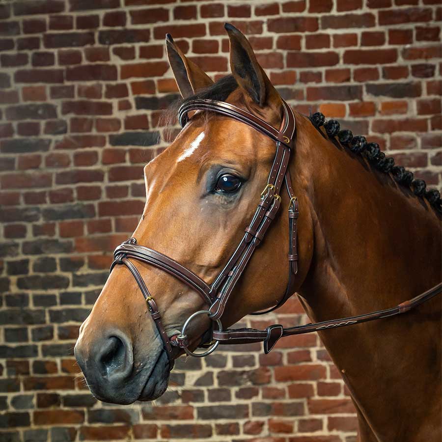 Det anatomisk utformede nakkestykket har en S-form som effektivt avlaster trykket bak hestens ører og gir økt komfort. Pannbåndet og nesereimen har et lett opphøyd midtparti som gir et elegant og raffinert uttrykk.