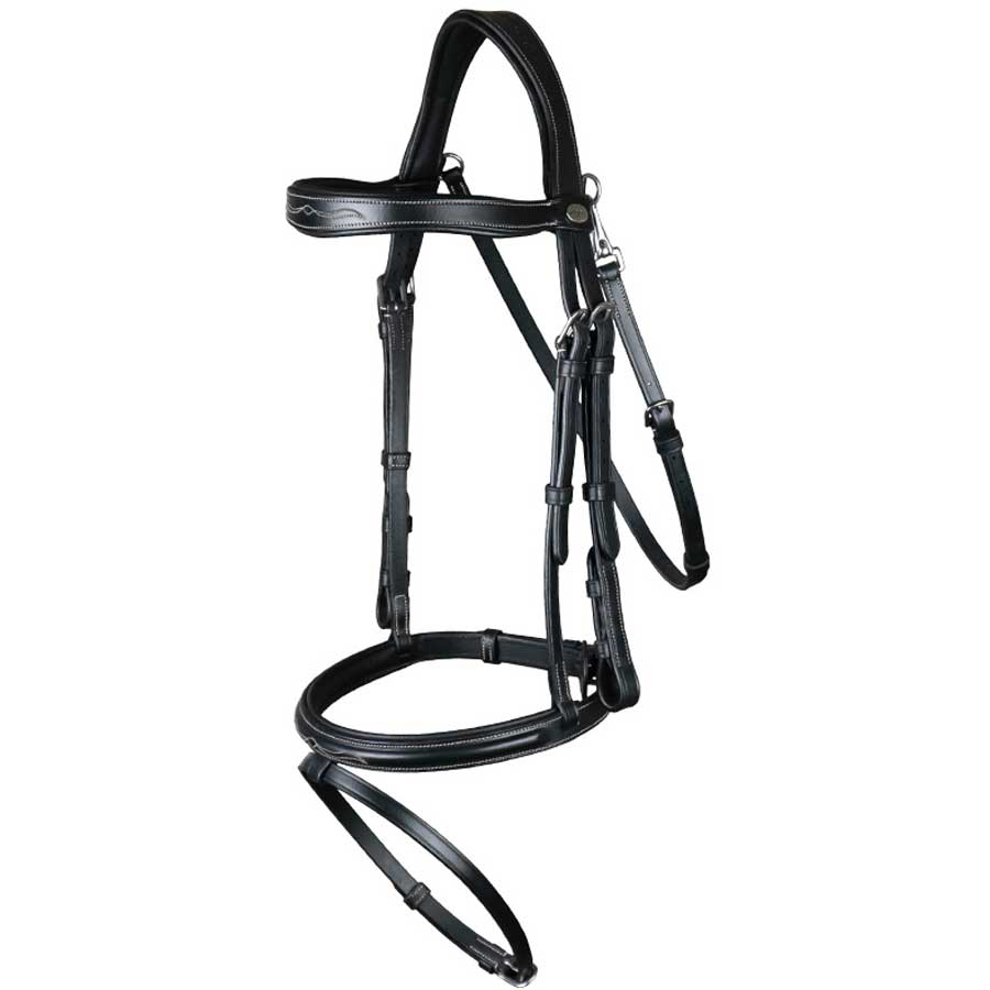 Et stilrent, svart hodelag fra Dyon Working Collection, laget i slitesterkt bøffellær som gir lang levetid samtidig som det er mykt og smidig i bruk.