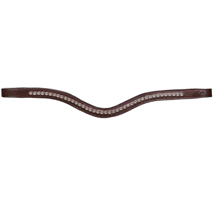 Elegant bøyd pannebånd i spanskt lær med hvite skinnende Swarovskikristaller. Stilrent pannebånd med sømmer ton i ton med læret og Dyon-logoen på siden i sølv for å matche hodelag, tøyler og annet utstyr i New English Collection. Artikkelnr: