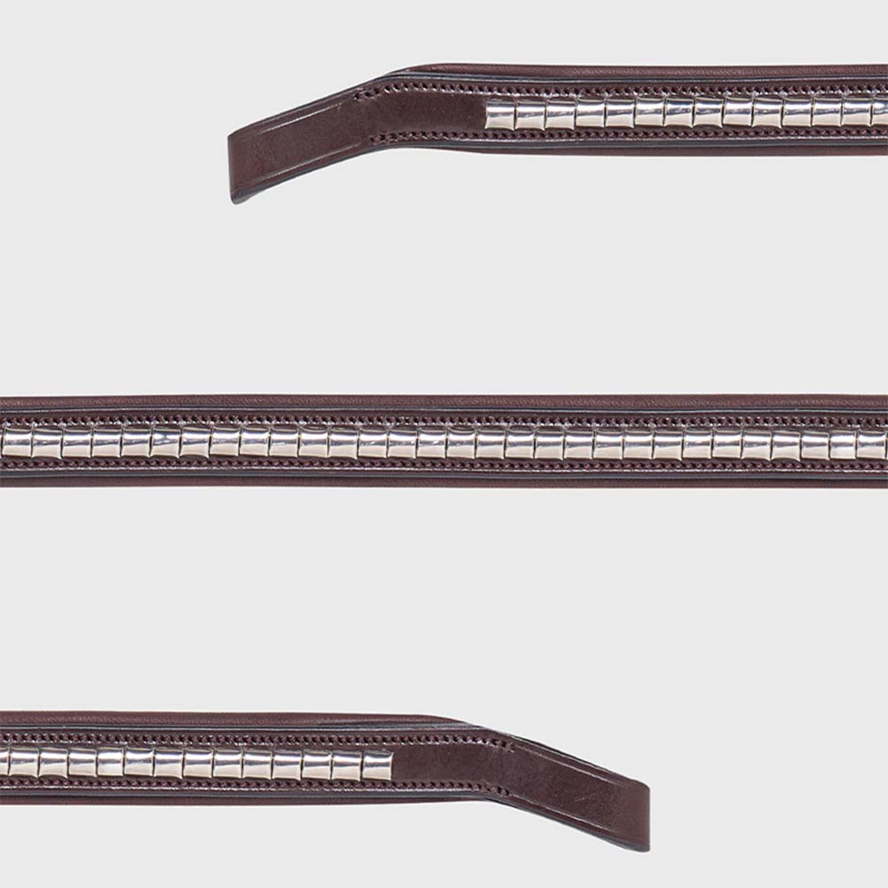 Brunt, mykt polstret pannebånd med sølvklinker - spesiallaget for å kombinere høy eleganse med maksimal komfort. Pannebåndet er designet med en anatomisk passform som, gjennom en smart og innovativ vinkel ved trensefestet, sikrer at pannebåndet ikke ligger an og skaper noe ubehagelig trykk ved hestens sensitive ører.