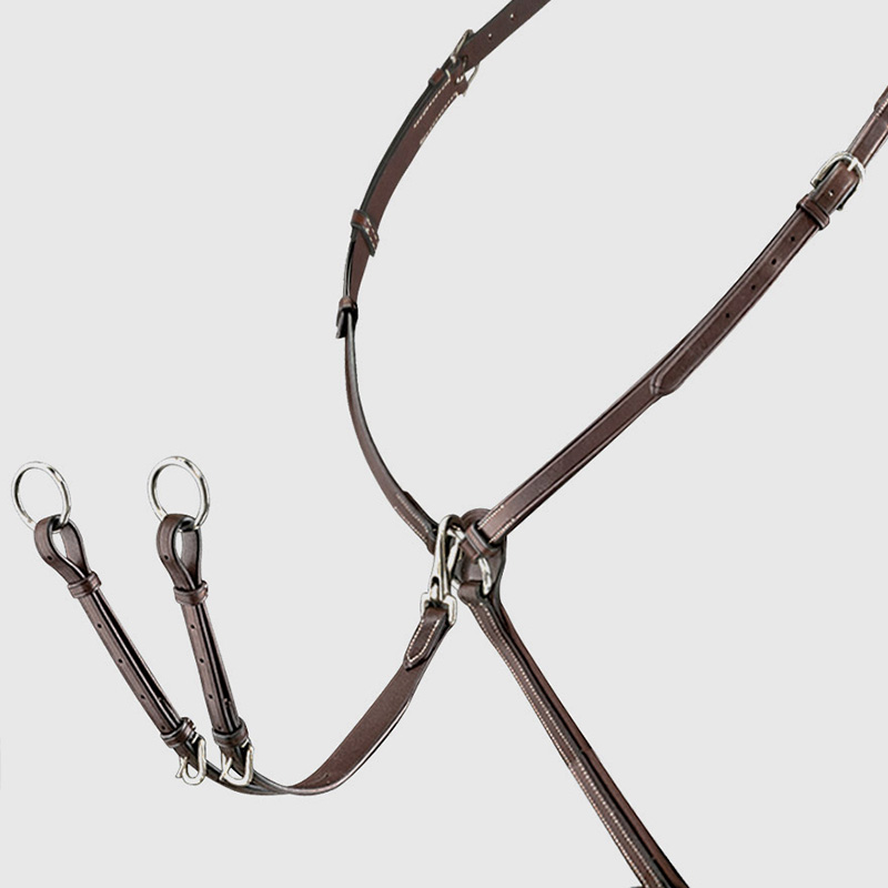 Et stilrent og elegant fortøy i brunt lær fra Equiline, med avtakbar martingal og fokus på både komfort og funksjonalitet.