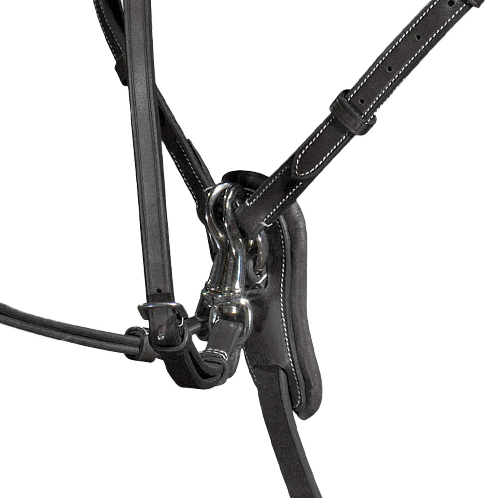 Virkelig flott forbygel, med avtakbar martingal, i svart lær. Den litt bredere, polstrede platen foran øker hestens komfort, samtidig som de store justeringsmulighetene sørger for optimal passform. I tillegg har forbyglen også detaljer med Equilines stilrene og velkjente logo på venstre side, en diskret liten detalj som, til tross for sin størrelse, gir en ekstra luksuriøs følelse.