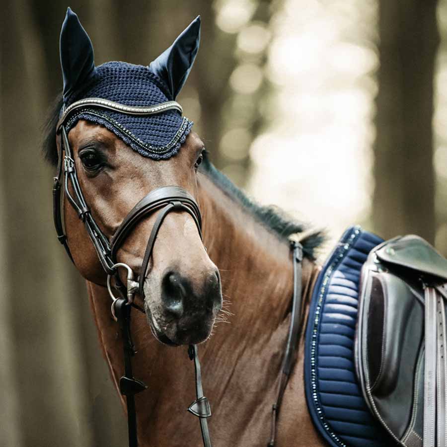 Ørehetten Long Stone & Pearl fra Kentucky er både funksjonell og stilren. Den beskytter hestens ører mot fluer under ridning, noe som gjør den til et praktisk tilbehør for varme dager. Ørehetten er håndstrikket, noe som gir en holdbar kvalitet, og den er prydet med steiner og perler i samme farge som ørehetten, noe som gir et elegant preg. Den lengre halsdelen forhindrer at ørehetten glir ned, og den elastiske passformen rundt ørene sikrer en behagelig og sikker passform. I tillegg har ørehetten ingen synlig logo, noe som gir ryttere eller sponsorer mulighet til å brodere sin egen logo. For å bevare kvaliteten anbefales håndvask.