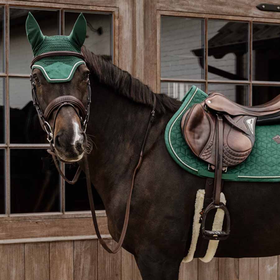 Ørehetten Wellington Velvet fra Kentucky er en stilren og funksjonell løsning for å beskytte din hests ører mot fluer under ridning. Den kombinerer et moderne amerikansk look med elegante fløyelsdetaljer, noe som gir et pent og praktisk tilbehør. Ørehetten er håndstrikket for å sikre holdbarhet og kvalitet, og den lengre halsdelen forhindrer at ørehetten glir ned under bruk. Siden den ikke har noe synlig logo kan ryttere eller sponsorer enkelt brodere sin egen logo på ørehetten. Materialet rundt ører er elastisk og har en smal passform, noe som gir en behagelig følelse for hesten. For å bevare produktets kvalitet anbefaler vi håndvask.