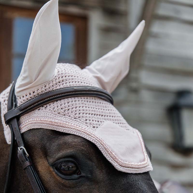 Kombinasjonen av fløyel og vakre perler gjør denne ørehetten til en ekte blikkfang! Basen er heklede for hånd, for best mulig holdbarhet, og den matches med svarte, stretchy ører som gir en slank passform og holder fluer og andre insekter borte. Nakkepartiet er forlenget for at hetten skal sitte trygt på plass under treningen, og fronten er stilren, uten logo, slik at du kan brodere den hvis du ønsker.