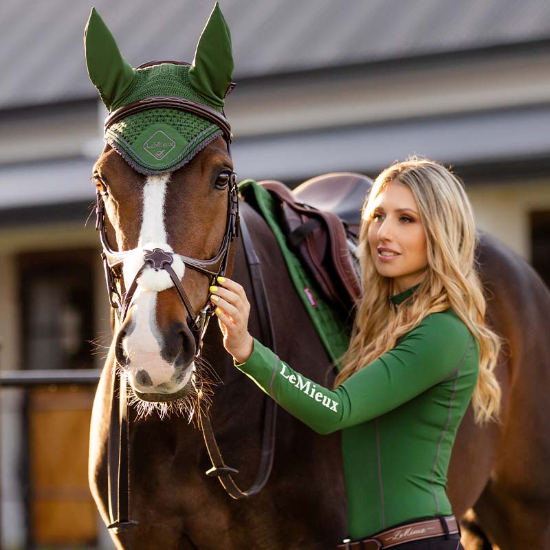 LeMieux Classic er en grønn ørehette med grå kant, heklet for hånd i et mykt og fleksibelt fireveis stretchmateriale. Den sitter tett og stabilt, og den doble piping-detaljen i kontrastfarge gir et ryddig uttrykk. LeMieux-logoen er brodert foran.