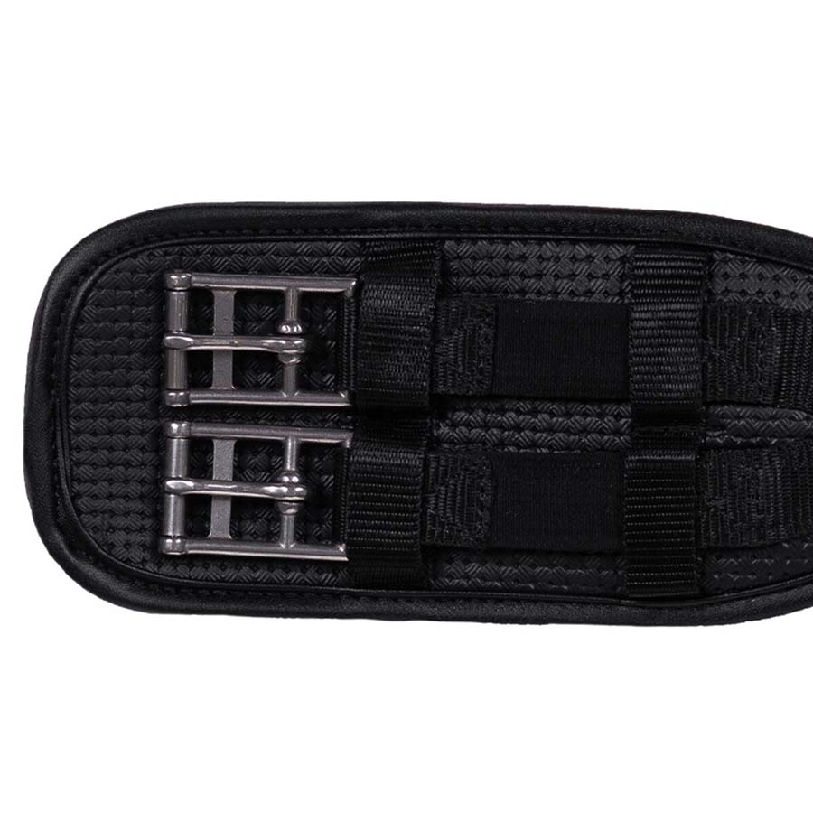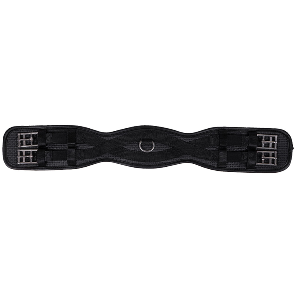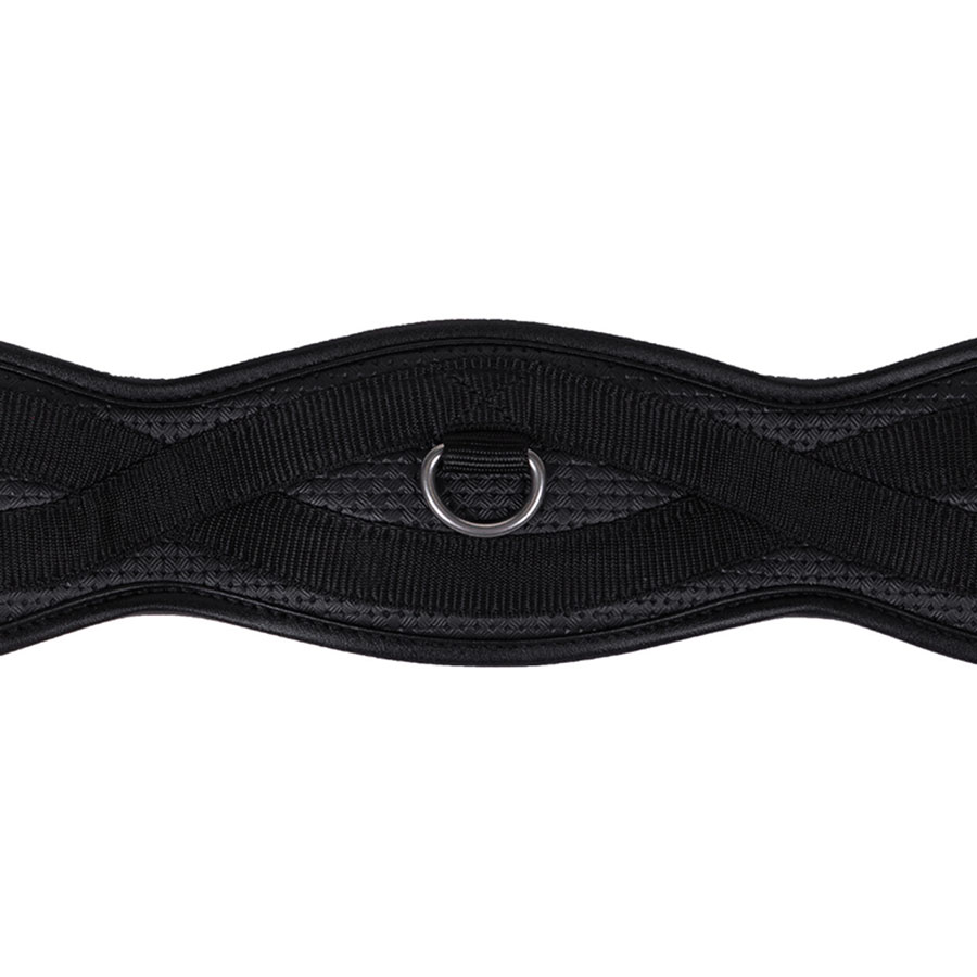 Svart, anatomisk dressurgjord fra QHP, designet for å gi hesten bedre komfort og bevegelsesfrihet. Gjorden har elastikk i begge ender, samt en ring på undersiden for å feste hjelpetøyler. Modellen har også rullespenner i rustfritt stål for å gjøre det enklere når du skal stramme gjorden.