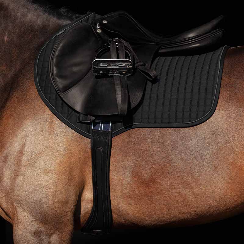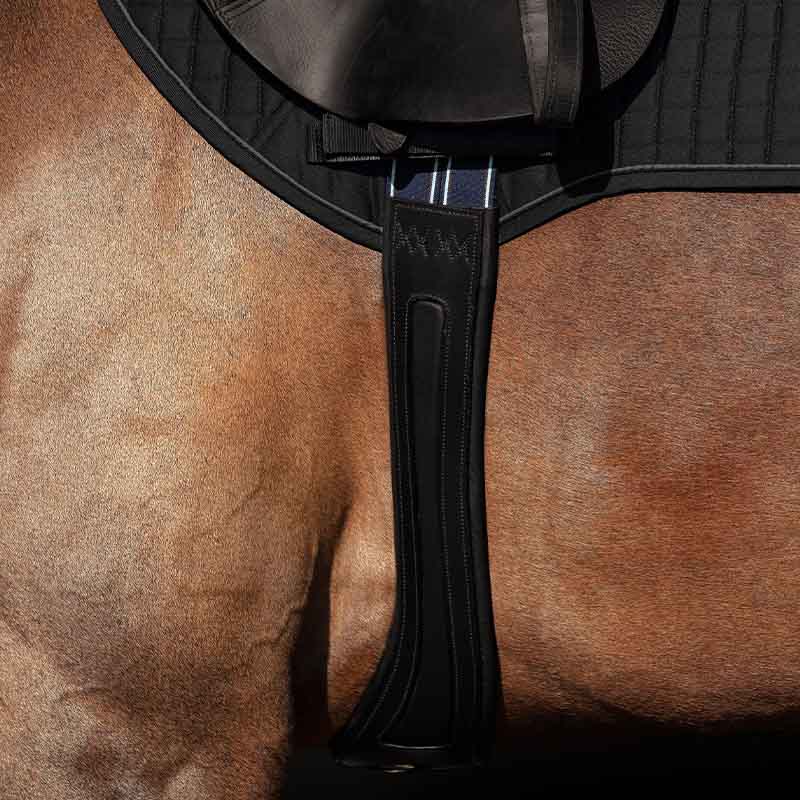 Laget i høykvalitets lær med elastiske partier, dekorative sømmer og sølvfargede spenner. Gjorden har også et innovativt spor som gir ekstra komfort ved bruk av martingal eller fortøy, uten å skape unødvendig trykk.