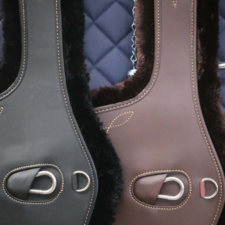 Trekket er laget i kunstig saueskinn, et dyrevennlig materiale som er både slitesterkt og enkelt å vedlikeholde. Det festes sikkert med sterke borrelåser, slik at det ligger stabilt under ridning.