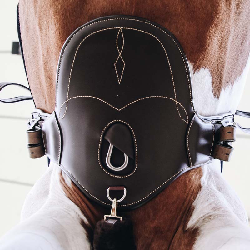 Den anatomisk utformede platen følger hestens naturlige bevegelser og bidrar til å redusere risikoen for skader fra sko og sporer. Samtidig avlaster den trykket rundt skuldre og albuer, noe som gir bedre bevegelsesfrihet og pust.