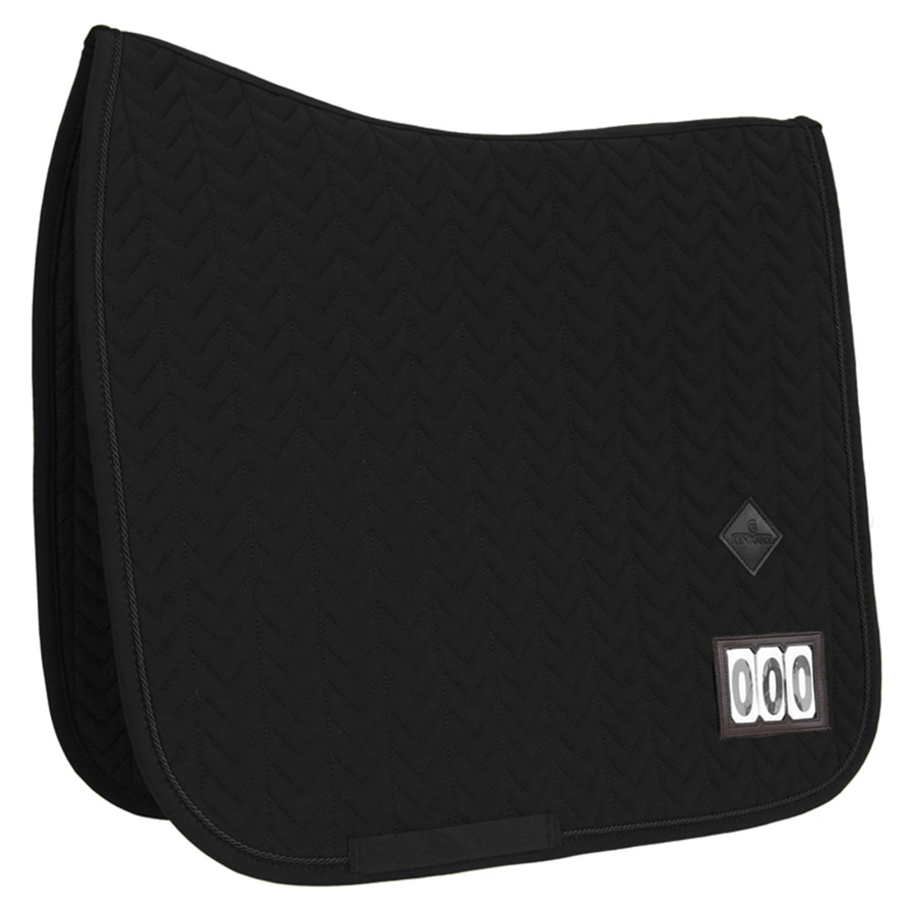Kentucky's Dressursjabrak Fishbone Competition er designet for både konkurranse og trening. Det har en avtagbar kunstlærplakk som gjør det enkelt å vise ditt startnummer, med tre nummer som inngår. Den unike fiskebensquiltningen gir et stilrent utseende, og uten sadelremmer er det lettere å bruke med kun girthremmer.