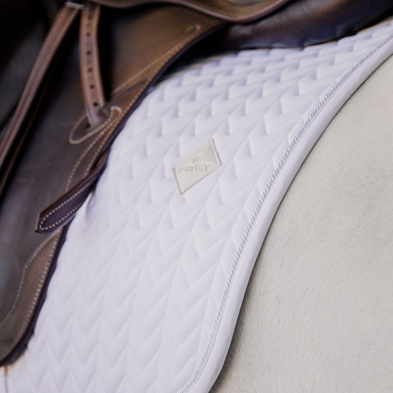 Dressursjabrak Fishbone er designet for å gi en utmerket demping mellom hestens rygg og salen, noe som beskytter mot friksjon. Det unike fiskebensmønsteret gir ikke bare et stilrent utseende, men også god pusteevne, noe som er viktig for hestens komfort under ridning. Jabraket har ingen salremmer, bare gjordremmer, noe som gjør det enklere å bruke og reduserer risikoen for at det sklir. Den subtile lærlogoen i samme farge som jabraket gir et elegant preg, og det er også plass til broderi hvis du ønsker å tilpasse det ytterligere.