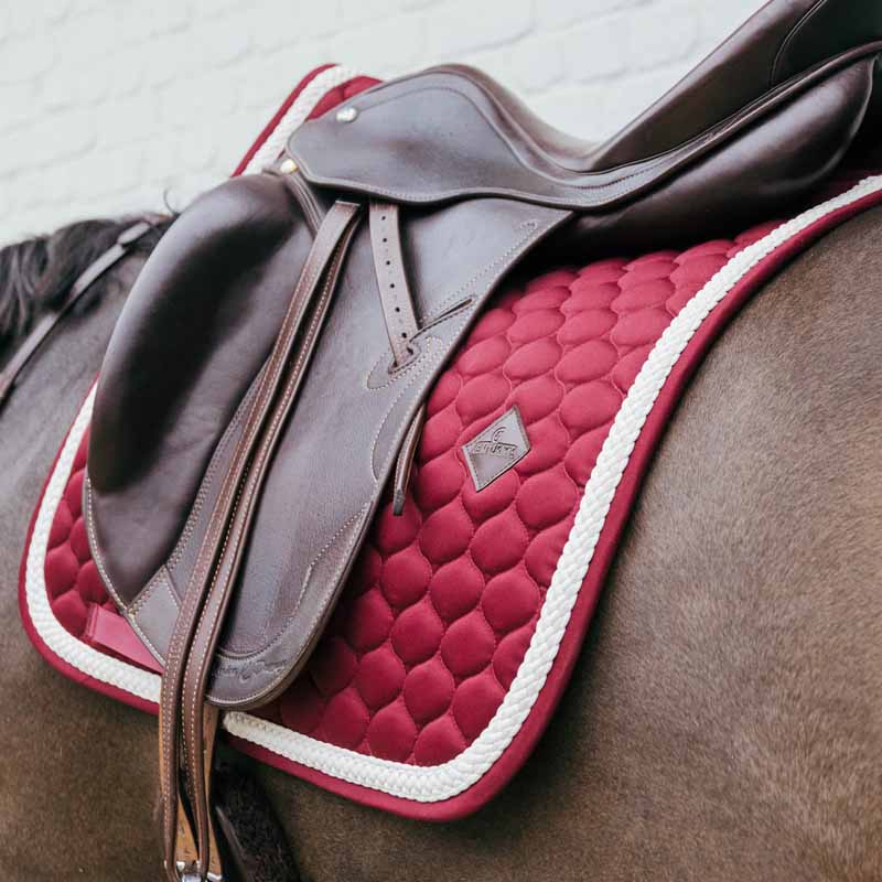 Dressursjabrak Plaited Cord fra Kentucky kombinerer stil og funksjonalitet på en utmerket måte. Det har et klassisk utseende med flettet snor og en unik quilting som gir en elegant touch. Jabraket er hurtig tørkende og svært pustende, noe som gjør det perfekt for intense ridetimer. En praktisk detalj er at det ikke finnes noen irriterende remmer for å feste jabraket på salen, noe som gjør det enkelt å bruke. Den indre strukturen er vaffelmønstrert for å holde jabraket på plass og gi en dempende effekt under salen. Det er laget av en blanding av bomull og polyester som effektivt absorberer svette. For å holde jabraket i god stand anbefales det å vaske det oftere hvis hesten din svetter mye under trening. Tørketumble ikke jabraket.