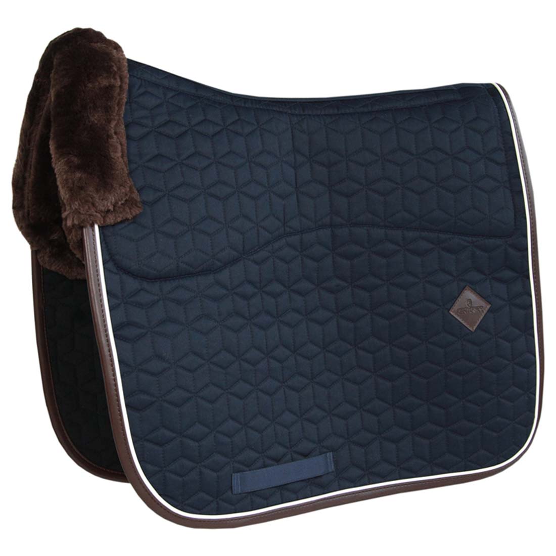 Kentucky's Dressursjabrak i marinblått er designet for å gi både komfort og stil. Med en innsides av kunstig fåreskinn og en spesiell kviltning, tilbyr dette schabrak utmerket demping mellom hestens rygg og salen. Det er spesielt egnet for hester med sensitiv hud, da det reduserer friksjon og støt. Den kunstige lærkanten og det hvite pipingen gir et elegant utseende, mens det unike mønsteret gjør schabraket unikt. Det har ingen irriterende stropper for feste ved salen, men kun en nylonrem for girth. I tillegg finnes det plass for brodering, slik at du kan tilpasse det etter din stil. For å holde schabraket i god stand anbefales maskinvask på 30 grader, men vask det så sjelden som mulig for å bevare kvaliteten. La det tørke utendørs på en solfylt dag.