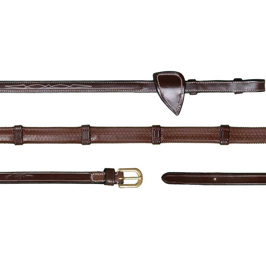 Tøylene er utstyrt med innovervendte spenner ved bittet for enkel feste. Dekorative kontrastsømmer, messingbeslag, preget Dy’on-logo og karakteristiske martingalstopp gir et klassisk og gjennomført uttrykk.
