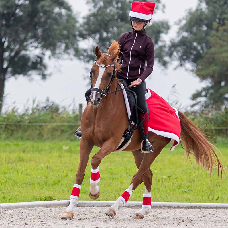 Superkoselig, rødt lendedekken med en myk kant i fuskepels - perfekt for både luciatog og juleshow, eller for deg som rett og slett bare vil maksimere julestemningen når du er i stallen! Holdes på plass med hjelp av smidige hurtigspenner som enkelt festes i rytterens stropp.
