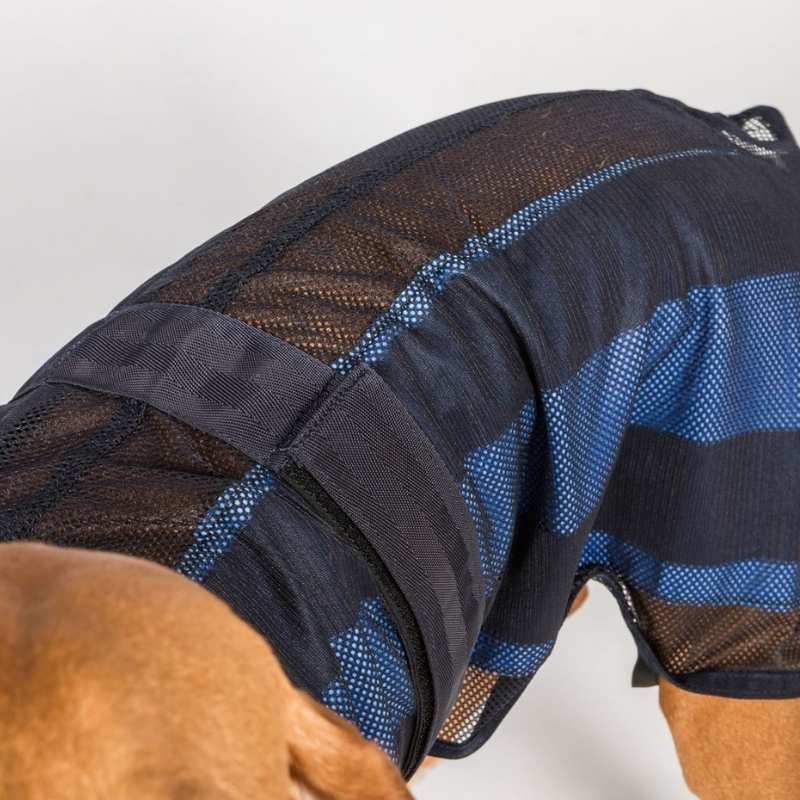 Back On Track Cool on Track 2.0 kjøledekken for hunder er designet for å gi effektiv kjøling uten å gå på kompromiss med komforten. Dekkenet har kjølemateriale på sidene av kroppen, mens ryggen og nyreområdet er dekket med et nettingmateriale. Dette gjør det spesielt egnet for raser med tynn pels, sensitive hunder og eldre hunder. Det blå dekkenet kjøler en stor del av hundens kropp ved å absorbere store mengder vann, som deretter fordamper gjennom det ytre nettingmaterialet. Ingen kjemikalier brukes, og det er ikke behov for fryser. Dekkenet beholder sin kjøleevne så lenge det er vått og kan enkelt brukes igjen ved å bløtlegge det på nytt. Det lukkes med brede borrelåsbånd for å holde det på plass selv under intens aktivitet.