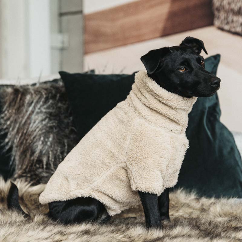 Den myke hundegenseren vil beskytte hunden din mot vinterkulden takket være det veldig myke og komfortable teddyfleece-materialet. Den elegante skjæringen dekker både brystet, frambeina og store deler av hundens kropp, samtidig som den ikke hindrer hunden i å bevege seg fritt.