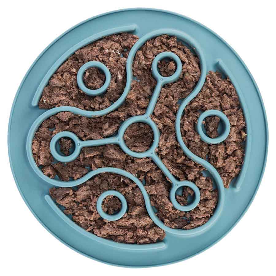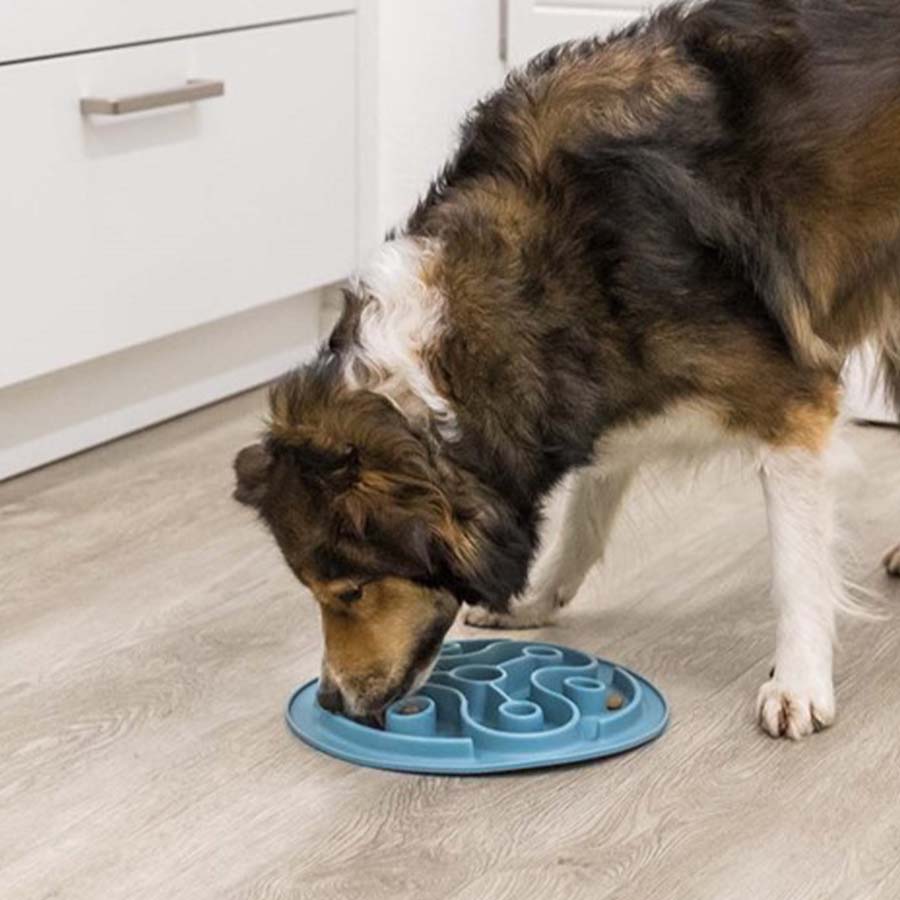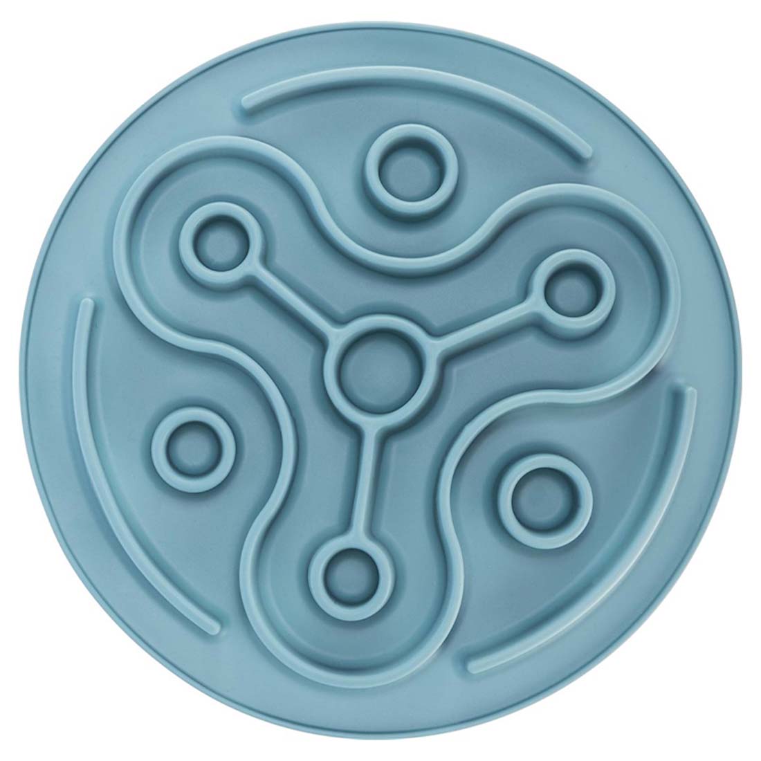 Den turkise, runde Slow Feed-matten fungerer med alle fôrtyper, og ønsker du at hunden din skal være opptatt ekstra lenge, kan du plassere den i fryseren en stund etter at du har fylt den med mat.