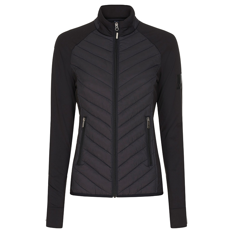 Hybridjakken, som lukkes med en full lengde glidelås foran, har også blitt utstyrt med elastisk kant, praktiske tommelhull ved ermesluttene og to romslige håndlommer, samt Equipages utskårne logo som en stilig detalj på den ene ermen.