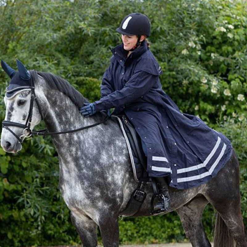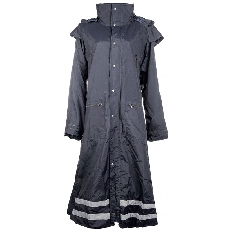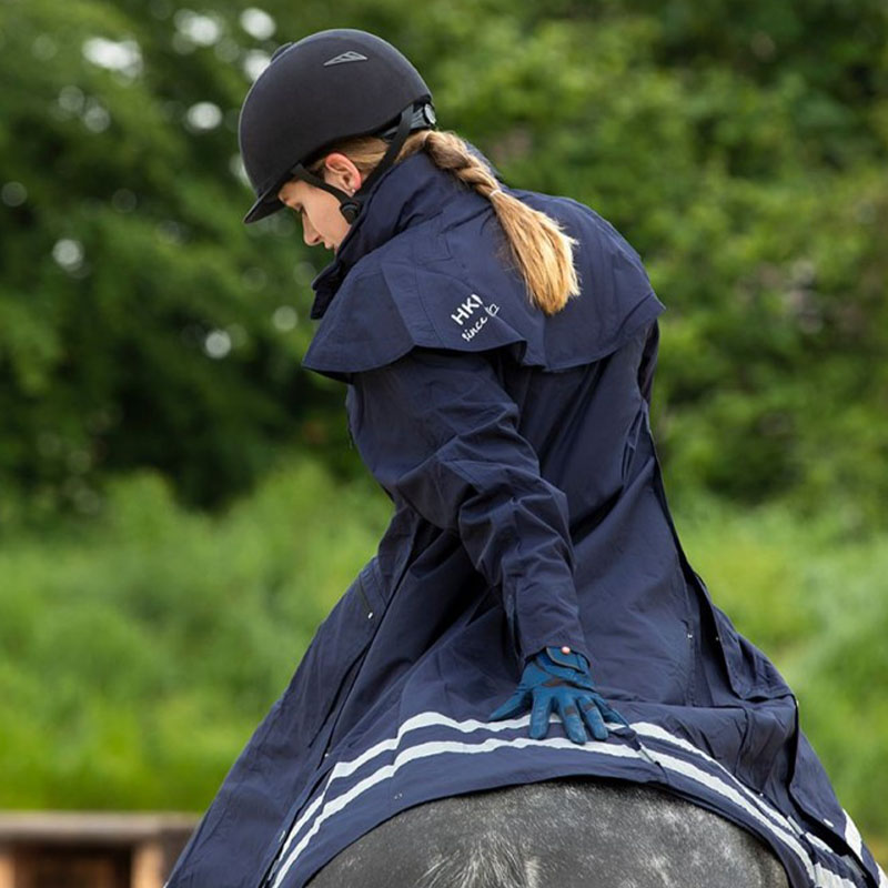 Praktisk regnkappe med mye funksjonell design. I tillegg til å være vind- og vanntett, har kappen svært god pusteevne, noe som gjør den komfortabel og anvendelig even under varmere årstider. Regnkappen har smidige benremmer som enkelt festes rundt lårene, for å sikre at kappen sitter på plass under hele rideturen. Den har et ridespalt, samt en toveisklaff, som bidrar til økt bevegelsesfrihet i salen. Kappens ermeslutninger er utstyrt med borrelås som lukker, og dermed stenger ute både vind og vann.