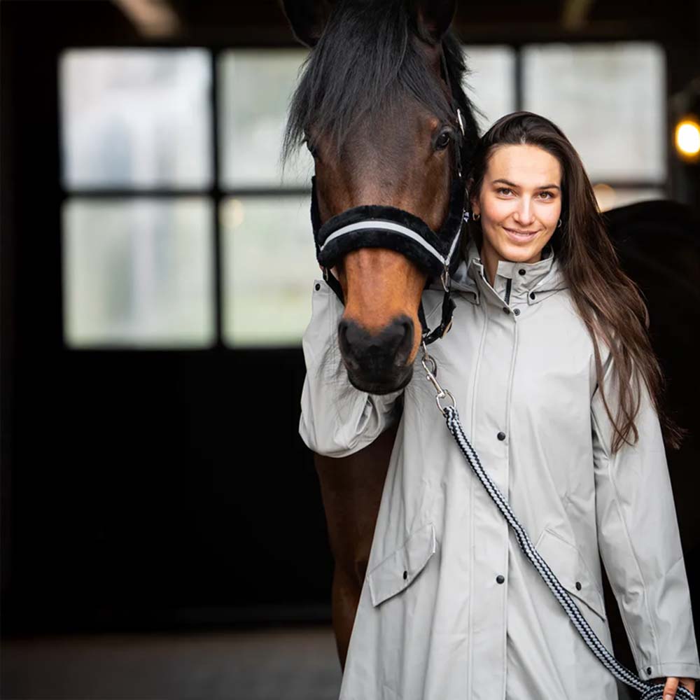 Mountain Horse Mindy regnfrakk for kvinner i beige er en pålitelig følgesvenn på regnværsdager. Den lange designen med sveisede sømmer sikrer at du holder deg tørr, mens den avtakbare og justerbare hetten gir ekstra beskyttelse. To store frontlommer med trykknapplukking gir praktisk lagring, og de justerbare ermeåpningene sikrer en komfortabel passform. Rideåpningen bak med innsats og trykknapplukking gjør den ideell for ridning.