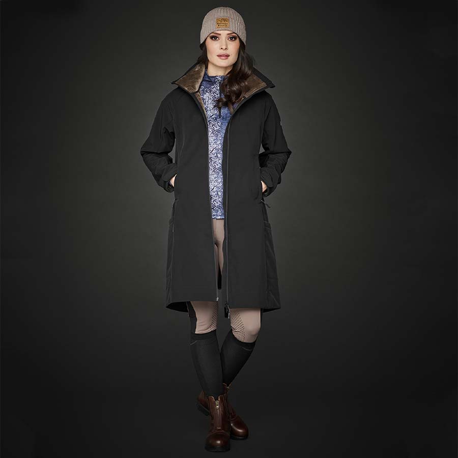 Stilren ridekåpe av softshell-material med en innside av herlig fuskpels og høy beskyttende krage. Kåpen er vanntett, vindtett og puster bra, som alle er egenskaper denne jakken til et perfekt ytterplagg å ta frem når den norske høsten sveiper over landet. Ørehetten er avtagbar slik at du kan tilpasse deg etter været. Selvfølgelig med ridslits slik at du sitter komfortabelt i salen og beskyttede lommer med glidelås.