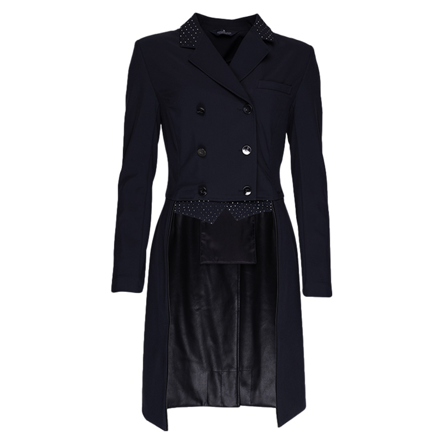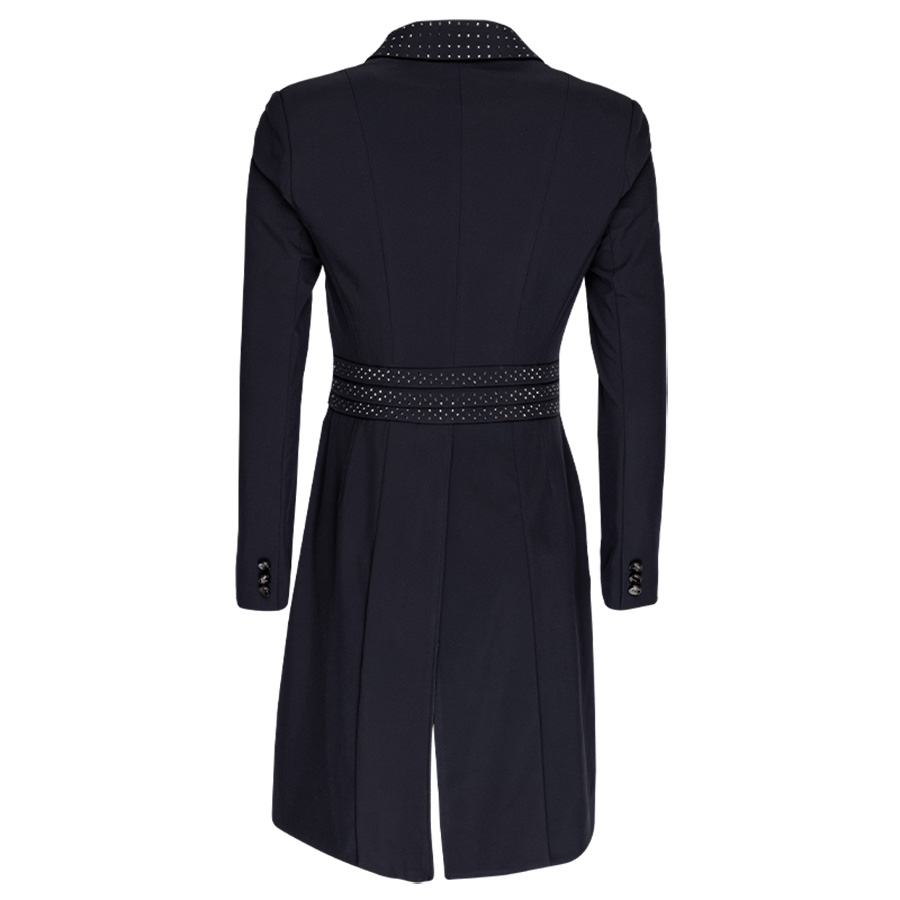 Den nedre delen av baksiden har også fått både en innside i høykvalitets, syntetisk lær og vekter i nederkant, for å sikre at jakken ligger på plass under hele rittet. Frakken, som kommer i en stilren, marineblå farge, lukkes til slutt med hjelp av seks stk sølvknapper foran.