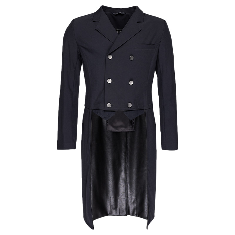 Nederste del av baksiden har i tillegg både en innside av høy kvalitets syntetisk lær og vekter i nederkant, for å sikre at jakken ligger på plass under hele ritten. Herrefrakken, som kommer i en stilfull marineblå farge, lukkes til slutt med hjelp av seks sølvknapper foran.